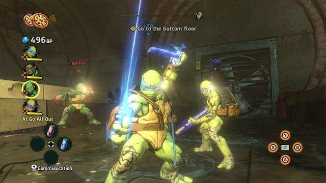 Als speler bestuur je 1 van de 4 Turtles. De andere 3 Turtles worden door de AI bestuurt. Ten alle tijden (mits je niet K.O. bent) is het mogelijk om te wisselen tussen de andere Turtles. Je hebt verschillende soorten aanvallen zoals normal/heavy attack, werpsterren gooien, counters en Ninjutsu. De Ninjutsu moves zijn speciale aanvallen die meestal veel schade veroorzaken, meerdere vijanden raken of je team healt. Er zit wel een cooldown op de Ninjutsu moves dus is het niet mogelijk om ze achter elkaar te spammen. Elke Turtle kan een Combo-Ninjutsu move doen die een super move wordt wanneer andere kameraden bij je in de buurt zijn. De Ninjutsu moves zijn te upgraden met experience die verdient worden door de levels te spelen. Gaandeweg worden meerdere moves ontgrendeld en elke Turtle is naar eigen wens te customizen. Alleen kunnen alle Turtles, alle moves gebruiken. Waardoor er een soort van eenheidsworst ontstaat. Want waarom zou je niet iedereen de meest effectieve moves geven? Er zijn geen situaties in het spel die je pushen om je strategie aan te passen. Hard beuken werkt het best. Iets wat nog een beetje variatie in de strijd brengt zijn items: plasma launchers (Turtle met een bazooka? Prima), mines, bombs, turrets etc. Deze items zijn in levels te vinden, maar kunnen ook bij de shop van Master Splinter gekocht worden.