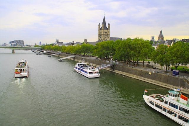 De Dom ligt niet ver van de rivier der Rhein af. Deze rivier is met 1233 kilometer een van de langste rivieren van Europa. De Rijn begint in Zwitserland en eindigt in de Noordzee in Nederland. Beide kanten van Keulen grenzen aan de Rijn en hier varen ook veel rondvaartbootjes rond. Een rondje over de Rijn tijdens een zonnige middag, of juist een diner op een rondvaartbootje, kan erg leuk zijn in Keulen. Tel daarbij de verlichting van verscheidene gebouwen bij op, zoals de RTL toren en het theater de Oper Köln, en de sfeer is compleet.