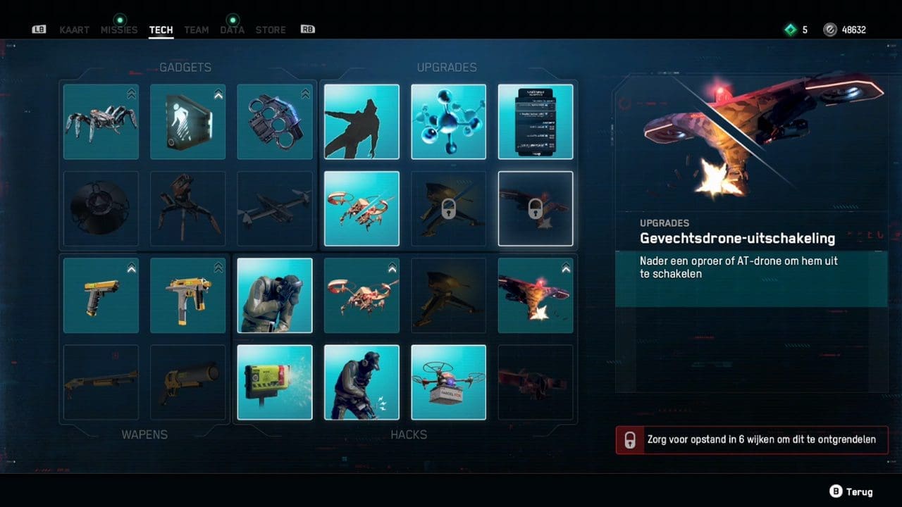 De vier soorten te upgraden tech: gadgets, upgrades, wapens en hacks