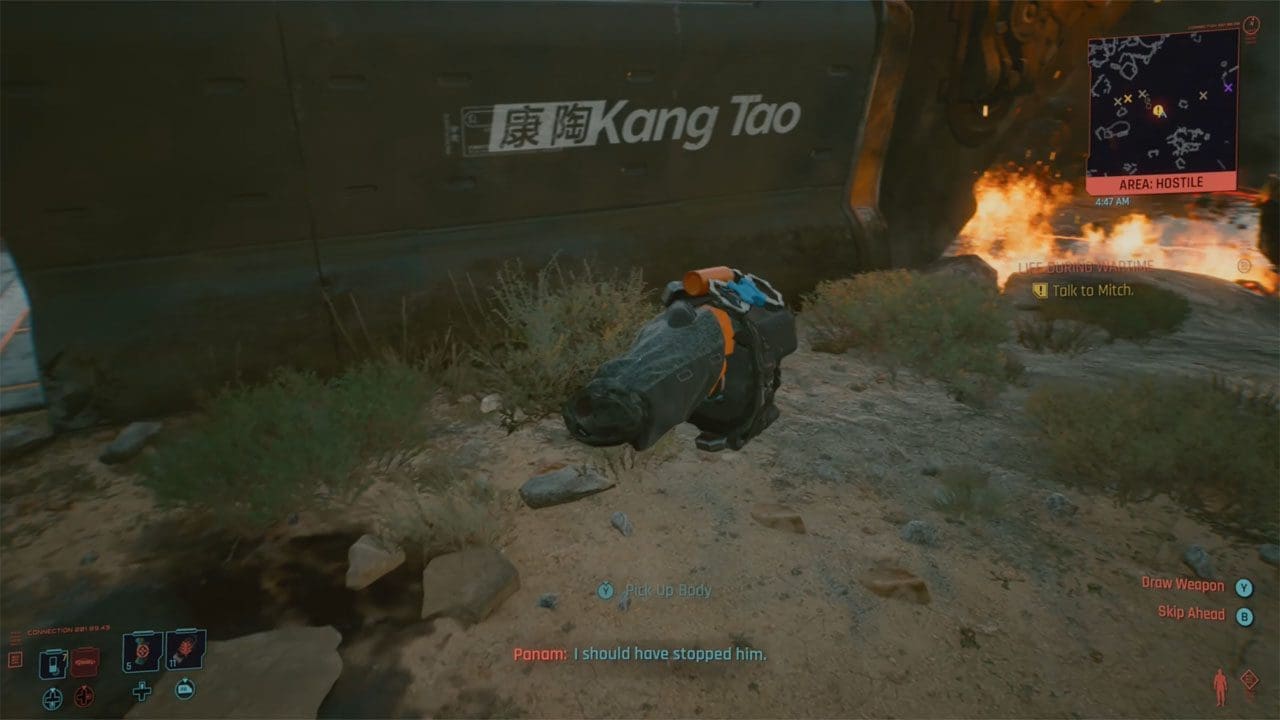 Wat ik wel mis in Night City is openbaar vervoer. In een futuristische stad als Night City had ik juist verwacht dat ik in zwevende Ubers kon instappen of een metrostation kon betreden. Ik had graag gezien dat je in een metro kon stappen en metrotunnels kon verkennen, maar dit is helaas niet het geval. Wel is er een transportbedrijf genaamd Delamain met zelfrijdende auto’s en een AI die je op een scherm verwelkomt als je instapt. En is er een reeks side quests speelbaar waarin je deze voertuigen moet terugbrengen naar het Delamain HQ.