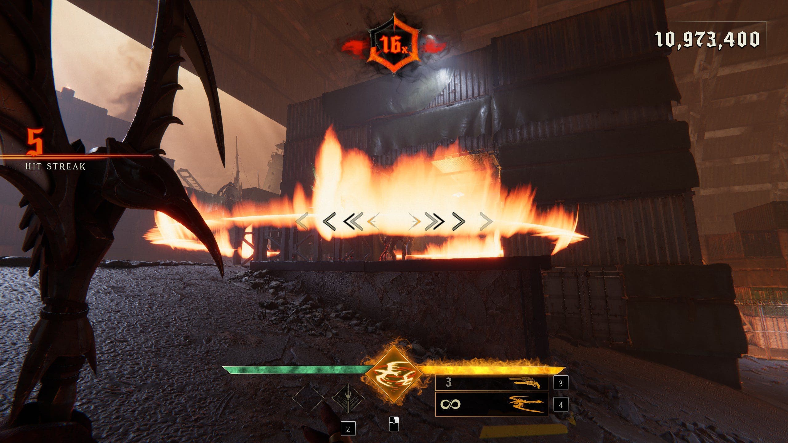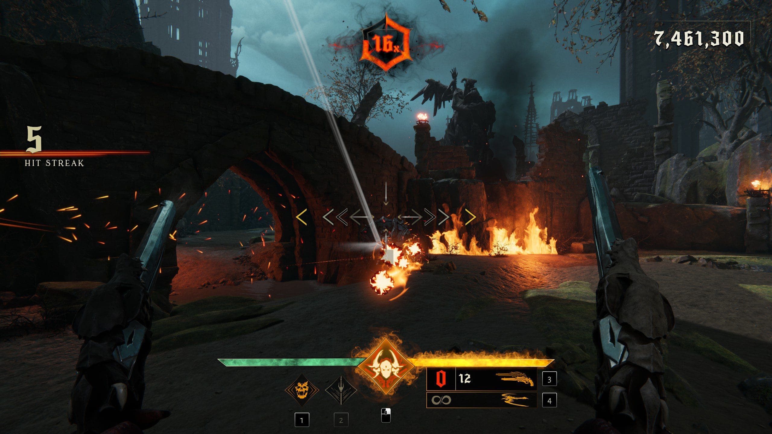 Zoals ik net al zei is Metal: Hellsinger een first-person shooter gemixt met een rhythm game. Dat wil zeggen dat je op het ritme van de muziek je vijanden kapot moet maken met meerdere melee wapens en firearms. Voor elke vijand die je doodt krijg je punten en deze punten worden vermenigvuldigd door de Fury Meter. Deze Fury Meter verhoog je door op het ritme vijanden te raken, te dodgen of met een bepaald wapen gewoon schoten af te vuren. Ook krijg je een flinke Fury Boost door vijanden te slaughteren. Een slaughter kill is vergelijkbaar met de Glory Kills van de nieuwe DOOM-games. Zodra een vijand bijna dood is kan je deze met een stijlvolle aanval doodmaken, en je raadt het al, ook deze slaughter kills moeten op het ritme van de muziek. Het gevoel wat je krijgt als je de vijanden kapot schiet terwijl je op het ritme van de muziek de inputs geeft is heerlijk en verslavend en je moet het echt zelf proberen. Er is een demo beschikbaar voor Metal: Hellsinger in de meeste digitale stores. Het ritme wordt aangegeven in het centrum van je HUD. Dus mocht je bang zijn dat je het met alleen de audio cue niet kan volgen heb je ook nog een visueel hulpmiddel. Zorg wel ervoor dat je aan het begin van Metal: Hellsinger de kalibratie-instellingen gebruikt zodat je de meest optimale geluid en beeldinstellingen hebt.
