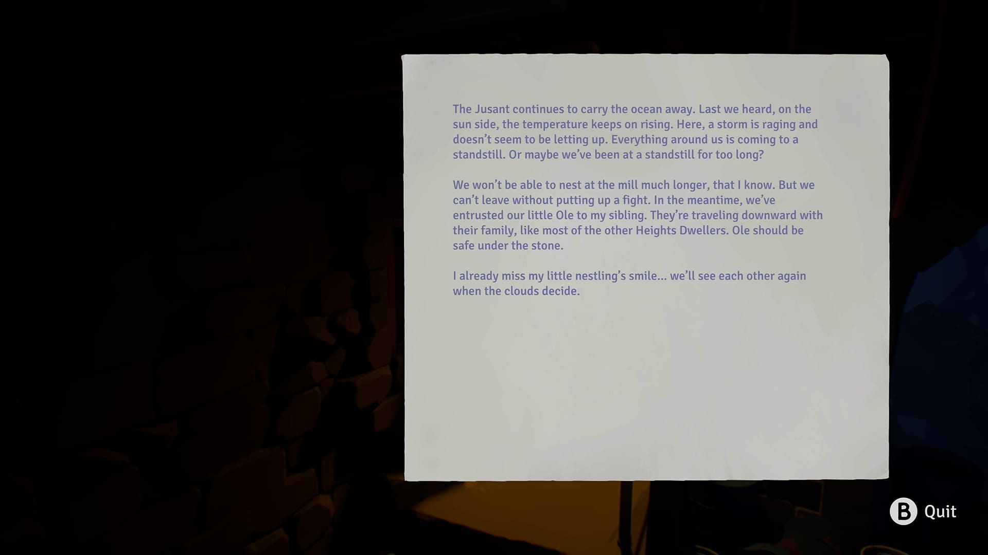 Jusant is een platformer die verdeeld is in zes hoofdstukken. Omdat je een toren aan het beklimmen bent zien de omgevingen in elk hoofdstuk anders uit. De wereld ziet er namelijk klei achtig uit en in elk hoofdstuk verandert het kleurenpalet. In het eerste hoofdstuk is er veel schaduw aanwezig, waardoor je nog niet vermoeid raakt tijdens het klimmen. Je belandt tijdens het klimmen door op oppervlaktes waar huisjes staan en collectibles te vinden zijn. Als je op een oppervlakte bent kun je alle richtingen oplopen en genieten van de mooie artstijl van de game. Ook vind je hier brieven en logboeken van personen die in de toren gewoond hebben. Jusant kent geen dialogen, omdat er geen andere personages voorkomen, maar bevat wel een rustgevende soundtrack die goed bij de sfeer past. De brieven en logboeken vormen samen met de animaties het verhaal van de game. Die aan het eind emotioneel eindigt, waarover geen spoilers.