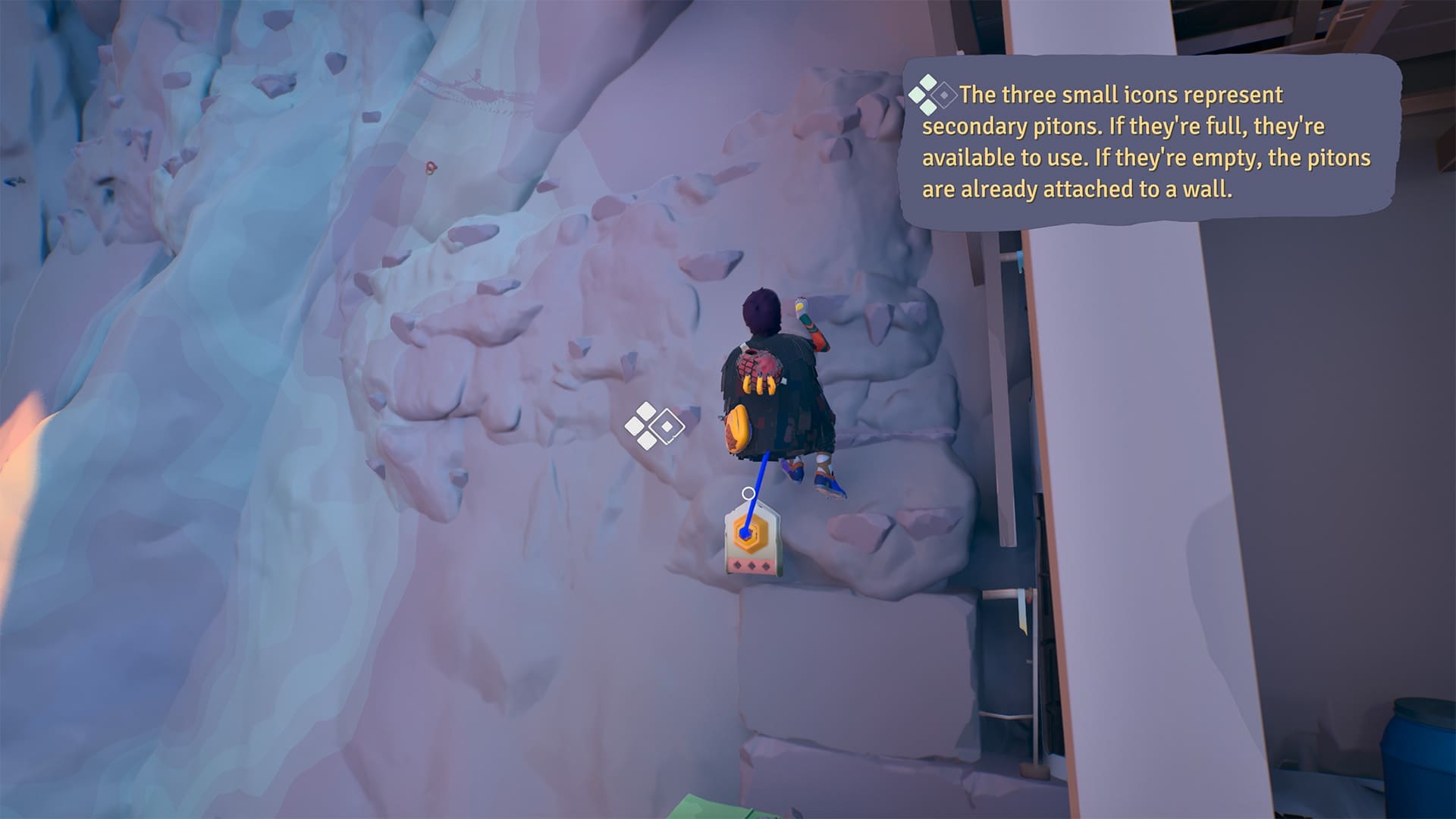 De controls worden aan het begin van de game in beeld uitgelegd en zijn vrij eenvoudig. Door de X-knop van de Xbox-controller in te drukken bevestig je de hoofdkarabijnhaak aan de muur. En door B ingedrukt te houden ontkoppel je het touw van de muur. Je beschikt over drie pitons die als vierkante icoontjes aan de linkerkant worden weergegeven. De pitons kun je tijdens het klimmen aan bijna elke plek bevestigen door de X-knop ingedrukt te houden. Dit zorgt ervoor dat je bij het vallen niet het hele stuk opnieuw hoeft te klimmen vanaf de plek waar je hoofdkarabijnhaak hangt. Je kunt namelijk niet dood gaan in de game. Als je tegen de rand aan loopt val je niet naar beneden, maar loop je tegen een onzichtbare muur aan.