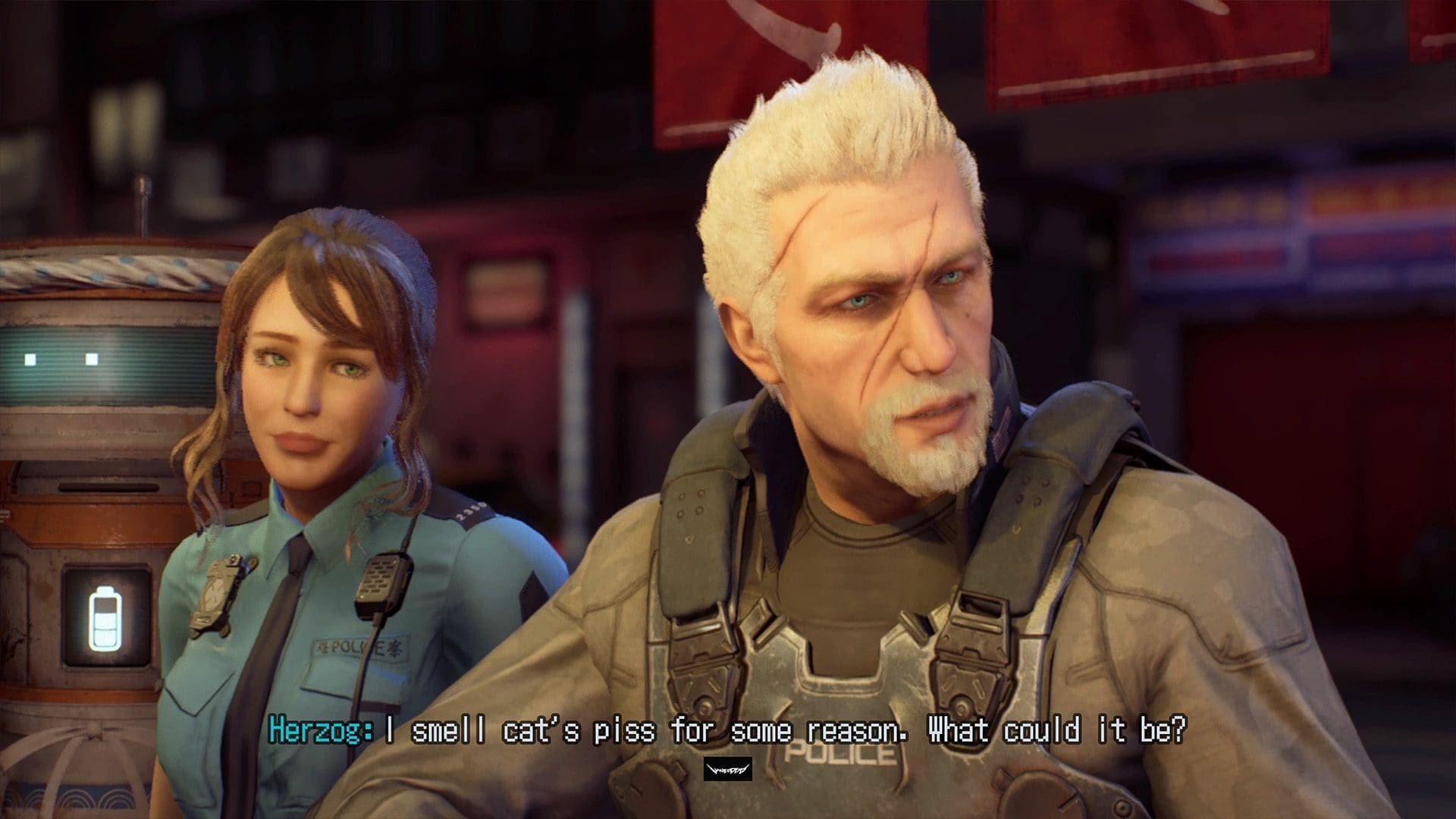 Waar tegenwoordig elke game de voice-acting net zo serieus neemt als een film is dit bij Wanted: Dead totaal niet zo. Het lijkt wel alsof de acteurs gewoon hun script hebben gekregen zonder enige vorm van context en zo hun zinnen ingesproken hebben. De delivery van hun lines valt soms zo uit de toon en je hebt daardoor echt het gevoel dat je een fever dream beleeft. Dit komt trouwens niet alleen door de voice-acting. Het lijkt wel alsof er geen regels zijn in het universum. Zo is er een cutscene waarin je ramen gaat eten en midden in het gesprek tussen Stone en Herzog schakelt ineens een narrator in die begint te vertellen over de geschiedenis van ramen.