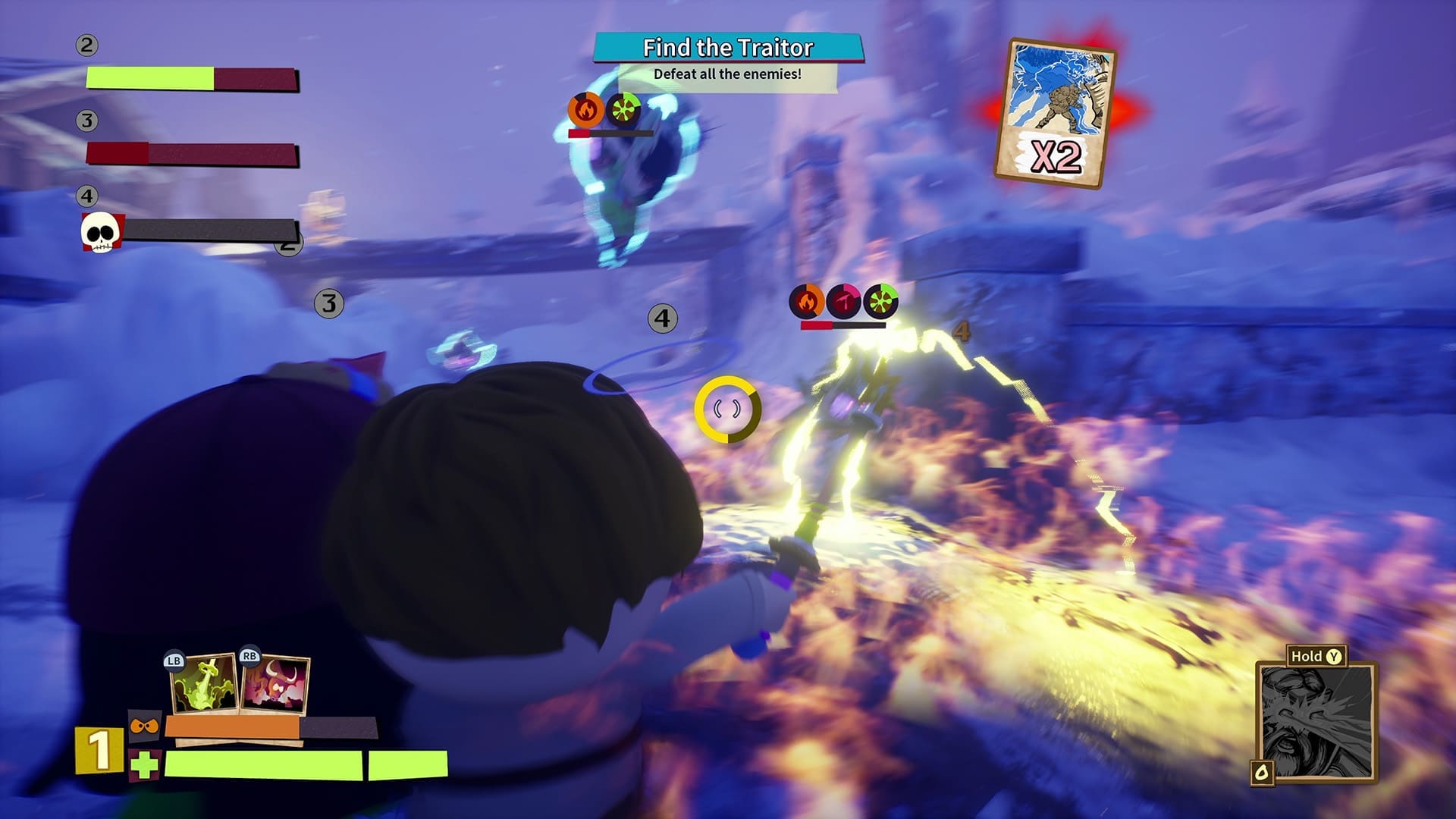 Helaas worden de gevechten na een tijdje juist saai en eentonig. Naast de twee powers die je activeert met de bumperknoppen en de Bullshit-kaart die je activeert met de Y-knop van de Xbox-controller, dien je vijanden simpelweg te slaan met je wapen. Dit doe je door de X-knop of de RT-knop op de Xbox-controller achter elkaar in te drukken. Door beide triggers ingedrukt te houden, kun je eindeloos een vlammenwerper gebruiken, maar daar blijft het dan ook bij. Je kunt geen gekke combo’s of andere soorten aanvallen uitvoeren door bijvoorbeeld de X- of RT-knop langer ingedrukt te houden.