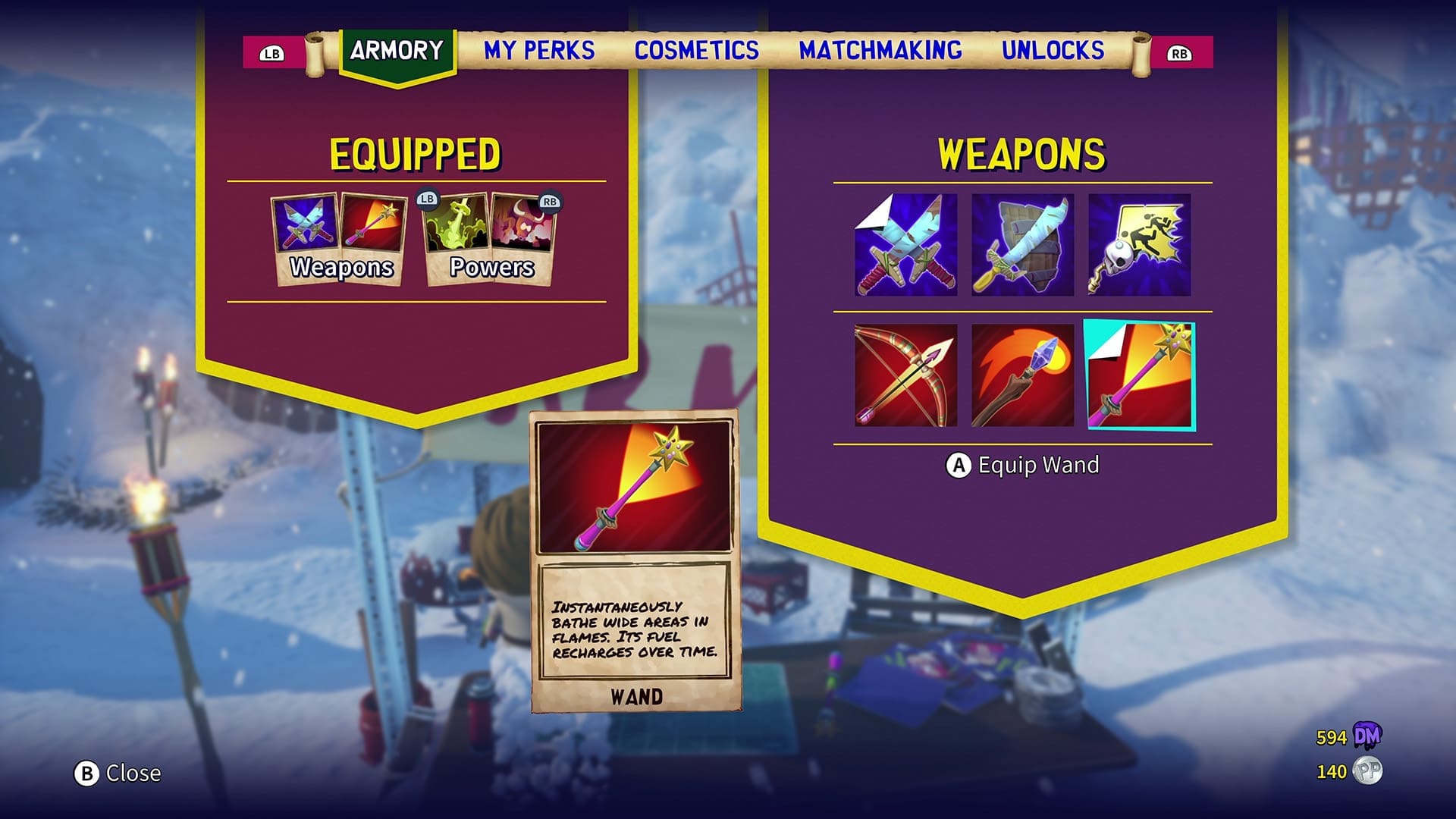 Voordat je in South Park Snow Day een chapter begint, kun je in Kupa Keep bij Tolkien je uitrusting kiezen en perks upgraden. Zo kun je kiezen uit twee van de zes wapens en twee van de acht powers. De wapens bestaan onder andere uit een dolk, bijl, zwaard en schild, en een toverstok. Als powers kun je onder andere kiezen uit een dronebom, schild en sneeuw turret. Maar er zijn ook gekke powers, zoals fart escape, waarmee je zo’n harde scheet laat dat je wegvliegt van vijanden. En bullrush, waarmee je een scheet laat en met volle kracht op een vijand afvliegt.
