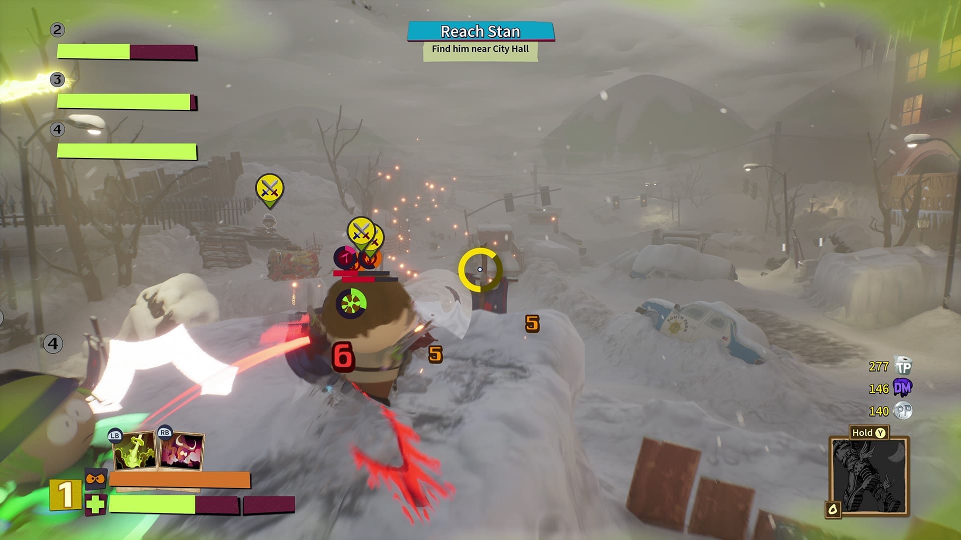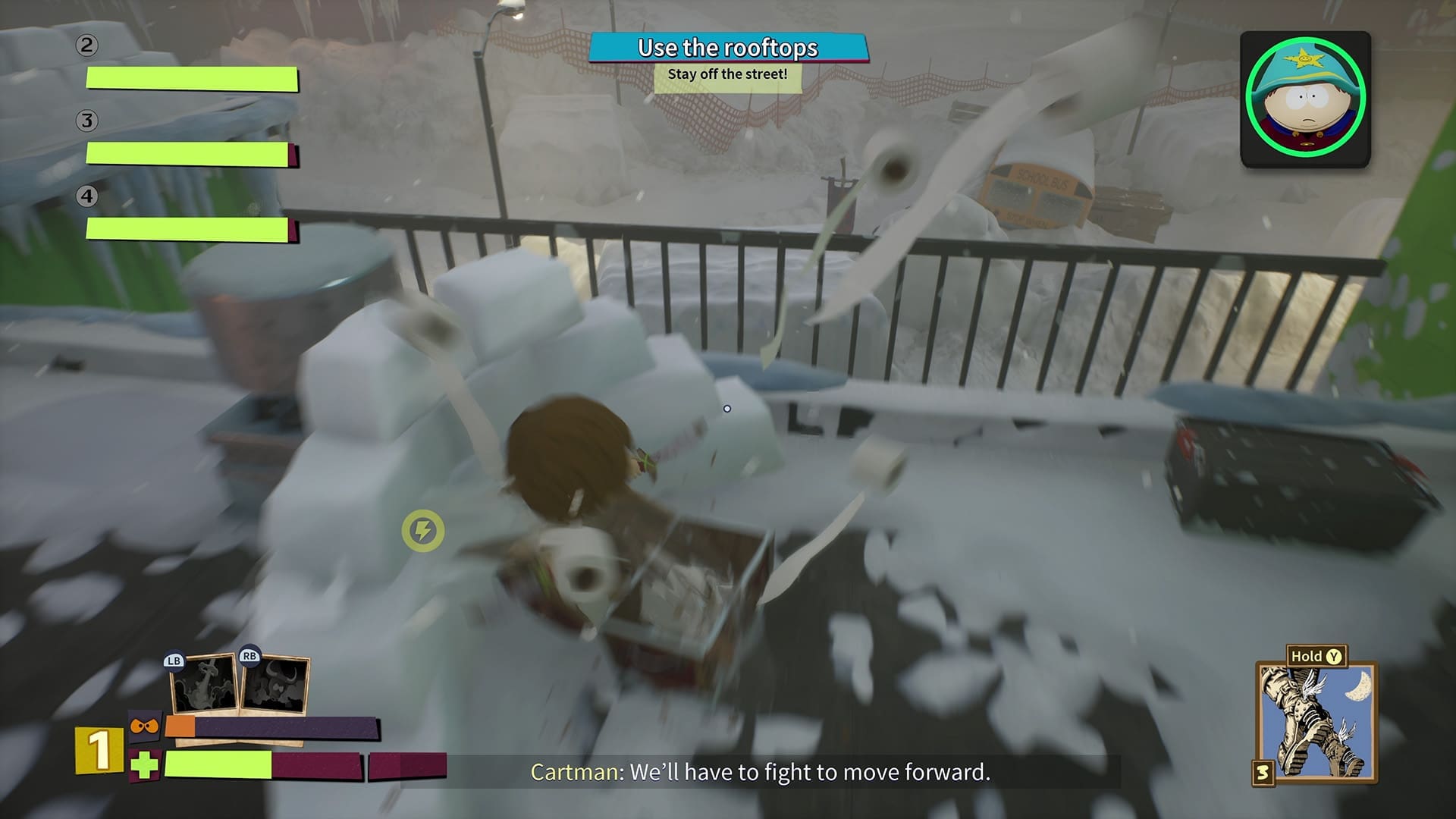 De chaotische combat is niet het enige kritiekpunt. South Park Snow Day saved namelijk niet per voltooide activiteit. Zo was ik erg pissed nadat ik vlak voor het einde van chapter 3 werd verslagen en het hele hoofdstuk opnieuw moest spelen. Een uur gameplay voor niets geweest! Dit terwijl mijn AI-teamgenoten nog in leven waren en mij hadden kunnen reviven. South Park Snow Day kan daarentegen ook met vier spelers in online co-op worden gespeeld. Misschien dat dit de game leuker maakt, omdat je dan niet afhankelijk bent van de AI en je vrienden je wel reviven.