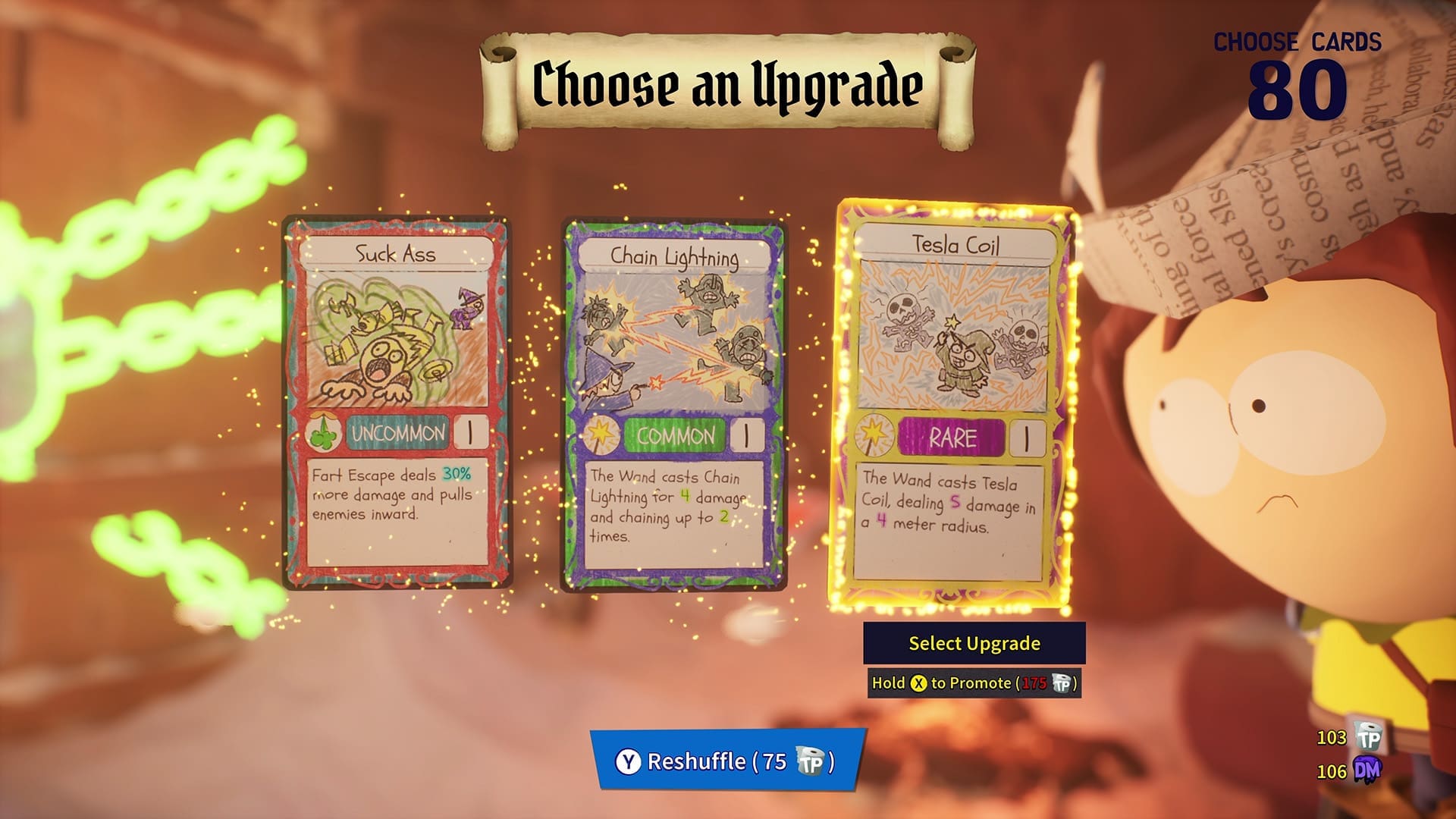 Aan het begin van een chapter kun je kiezen uit een van de drie upgrades die je worden aangeboden, maar als je te lang wacht, wordt er een kaart voor je gekozen. Met deze upgrades kun je extra schade aan vijanden toebrengen. Je kunt de kaarten ook reshuffelen voor 75 toilets papers. In elke chapter verzamel je namelijk toiletpapier als referentie naar de COVID-periode. Nadat je een gebied hebt voltooid, kom je Jimmy tegen die je een upgrade laat kiezen. Je kunt dan opnieuw kiezen uit één van de drie kaarten of deze reshuffelen. Op een later moment kom je ook een van de gothics tegen die je een upgrade laat kiezen.