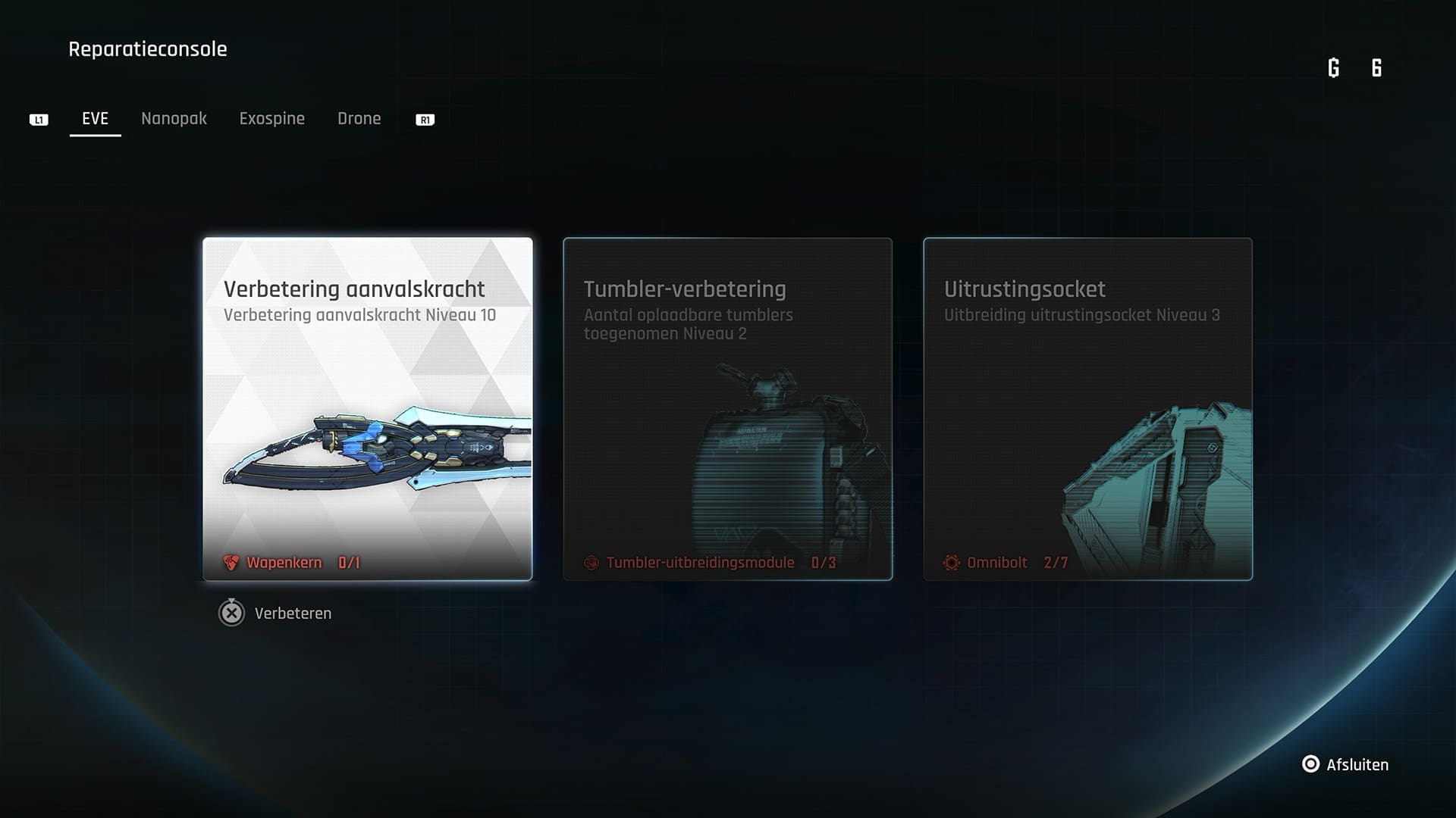 Als laatste bevatten kampen een reparatieconsole. Hier kun je upgrades uitvoeren voor je aanvalskracht, Tumbler en uitrustingsocket. Daarnaast kun je hier ook Eve’s outfit wijzigen, verschillende Exospines upgraden en je kunt hier zelfs skills van de Drone upgraden als je upgrade-modules hebt gevonden.