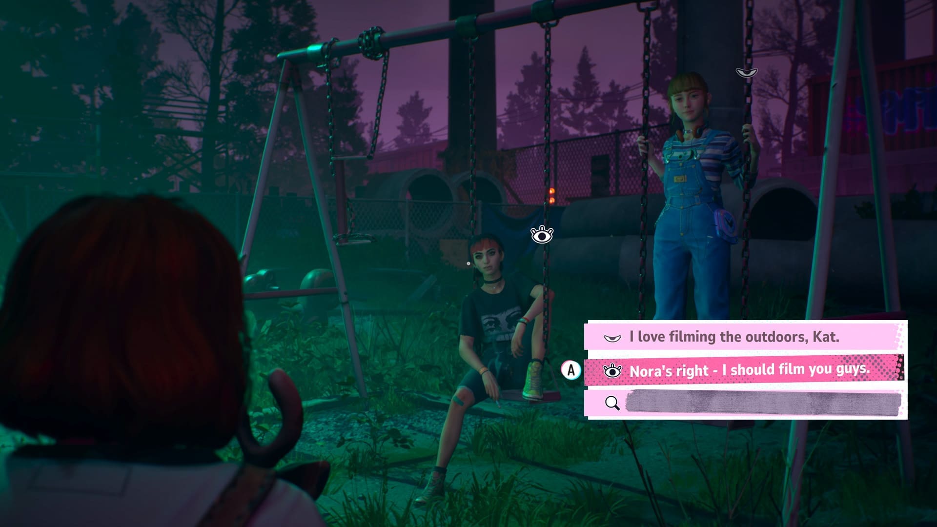Omdat Lost Records: Bloom & Rage zich richt op de vriendengroep, ben je voornamelijk bezig je vriendschap met de drie andere meiden te verbeteren. De dingen die je zegt en doet, bepalen hoe de andere meiden daarop reageren. Soms kun je kiezen uit diverse soorten antwoorden, waardoor je Swann’s karakter zelf vorm kunt geven. Bijvoorbeeld als Swann wordt gevraagd wat haar favoriete band is.